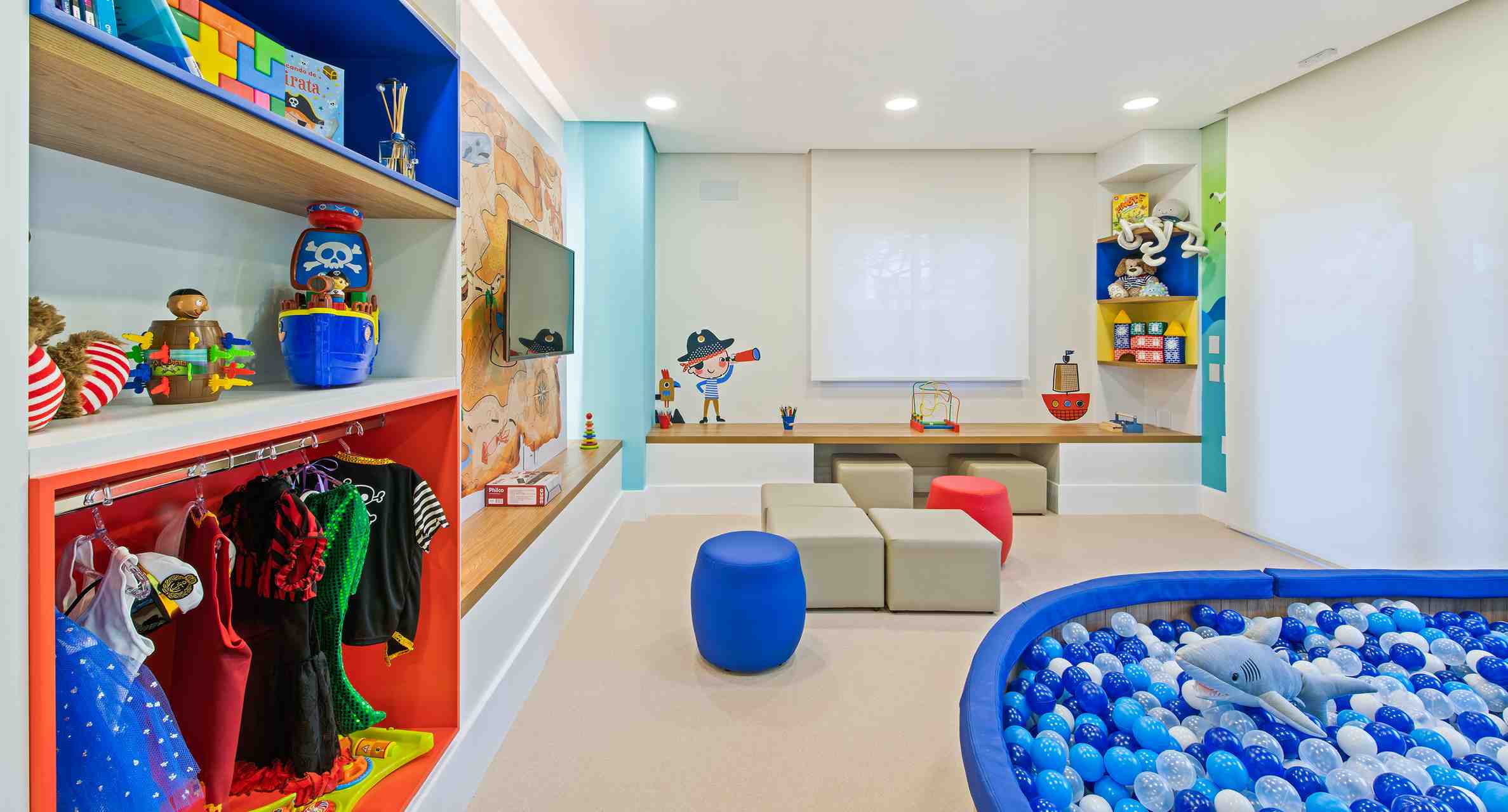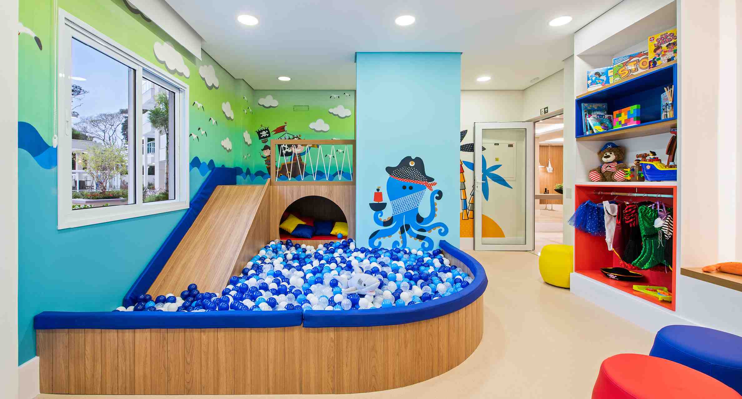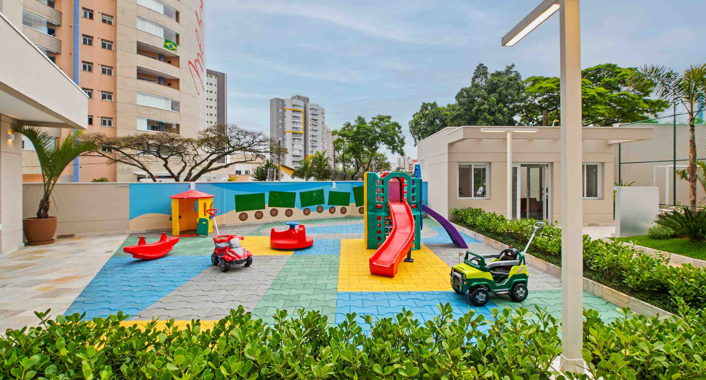 O playground da área externa vai garantir a diversão da garotada com gangorra, lousa, casinha e gira a gira. Já a brinquedoteca tem piscina de bolinhas, escorregador, bancada para atividades e TV LED.