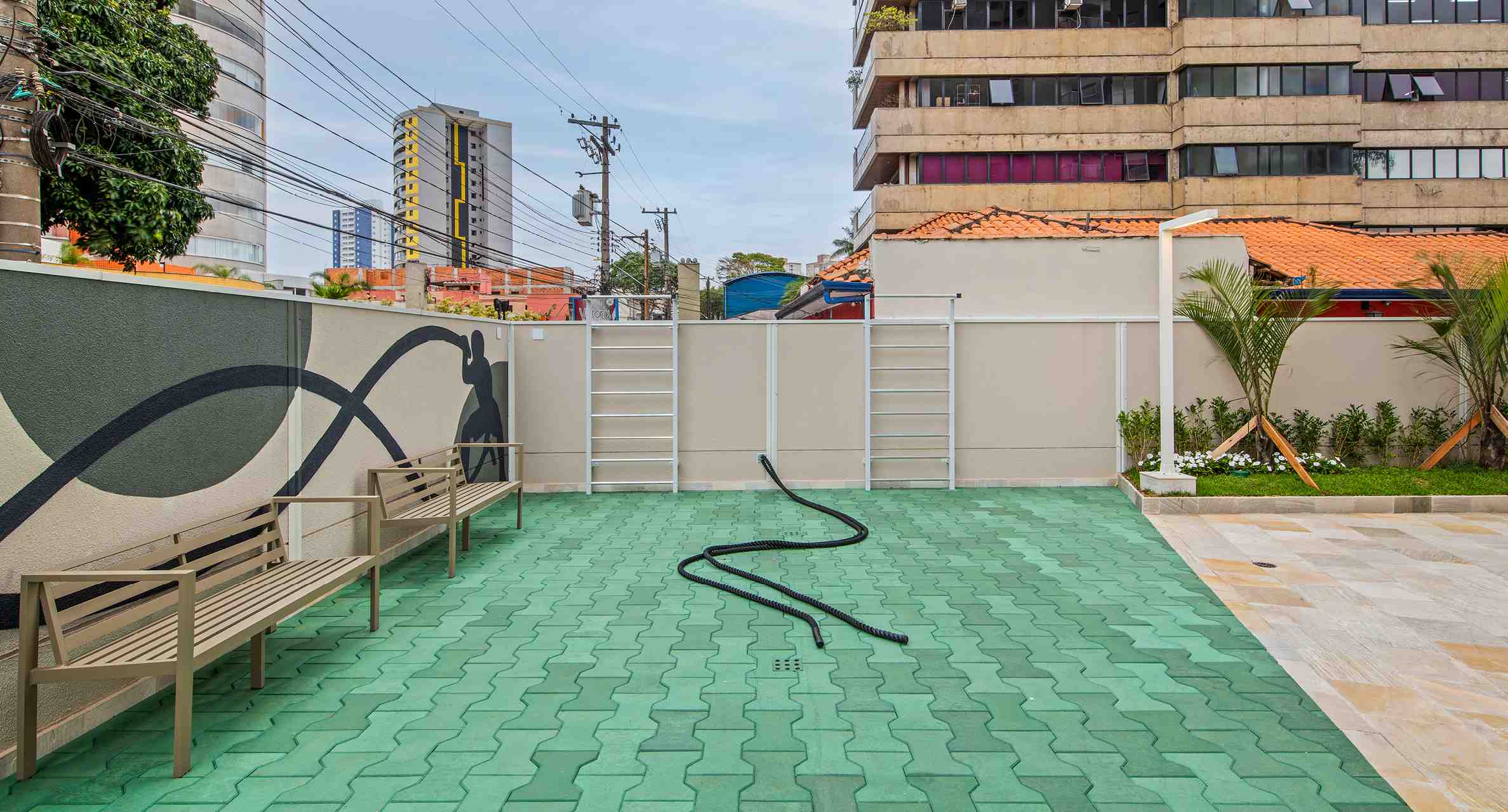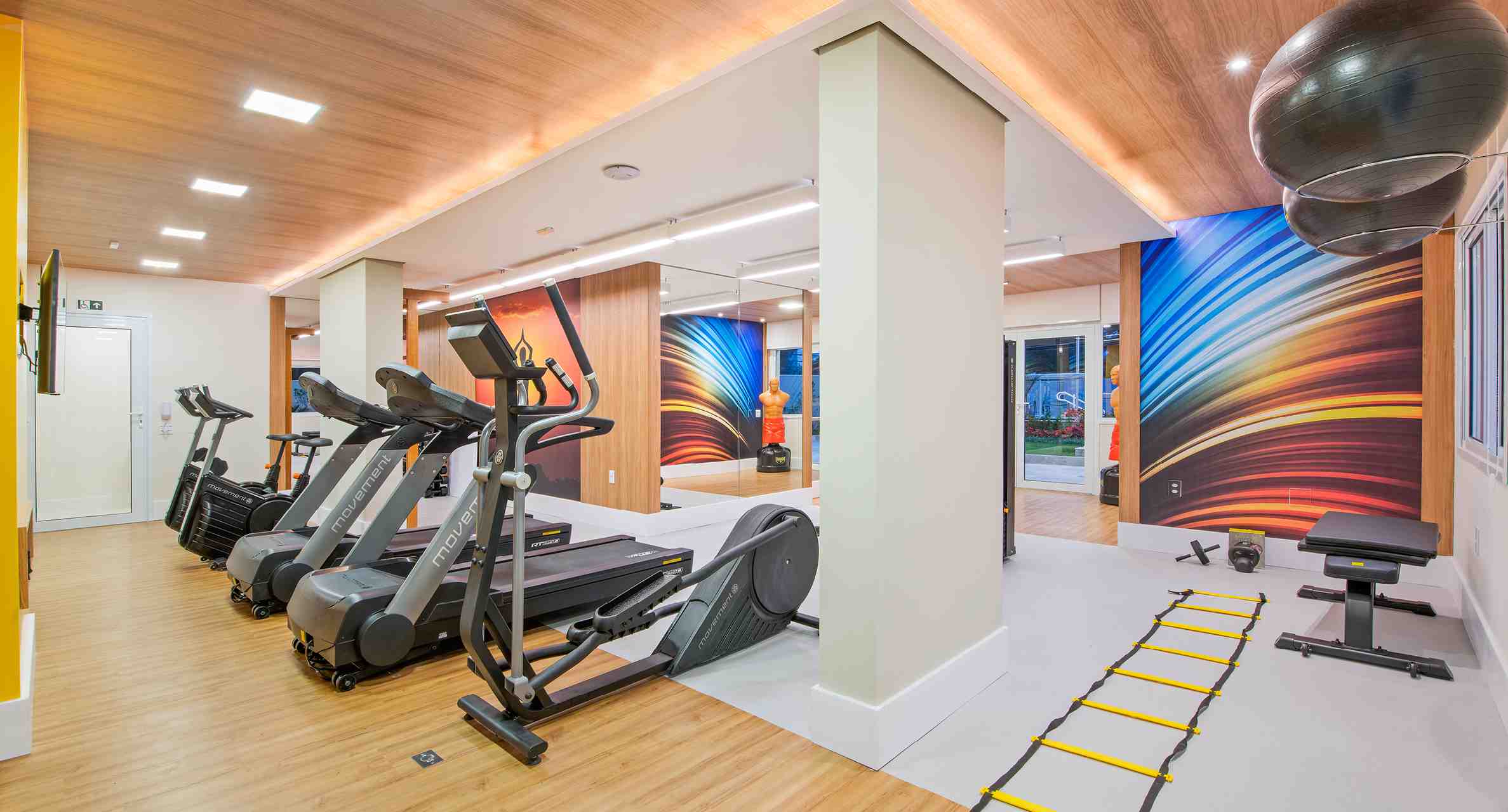 Ficará na área externa, próximo ao fitness, e será entregue com piso emborrachado destinado a treinamentos funcionais. O local terá 2 espalders para alongamento, corda, cones e muito mais. Já o fitness center é completo com esteiras, bicicletas ergométricas, estação de musculação e muito mais.