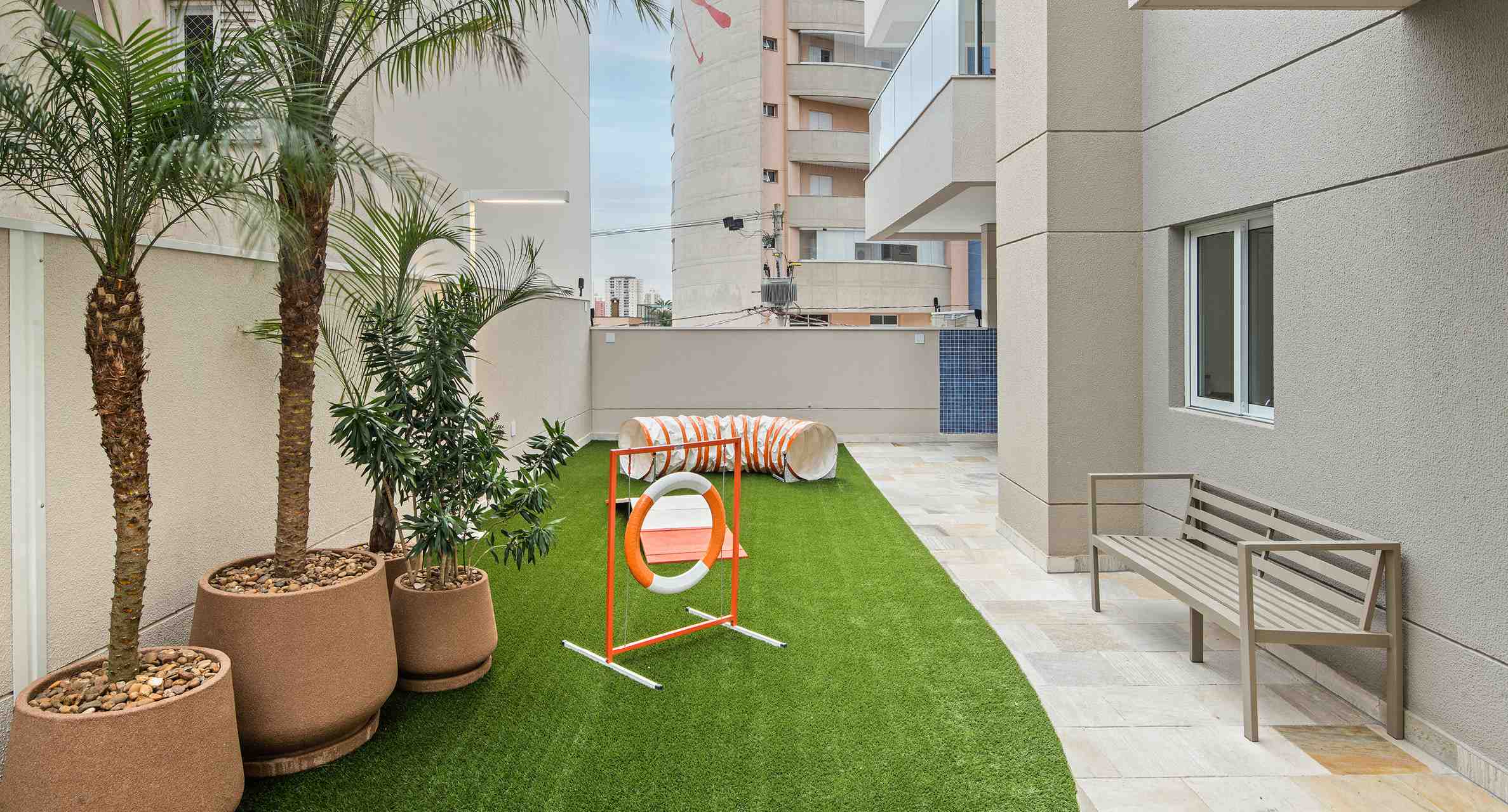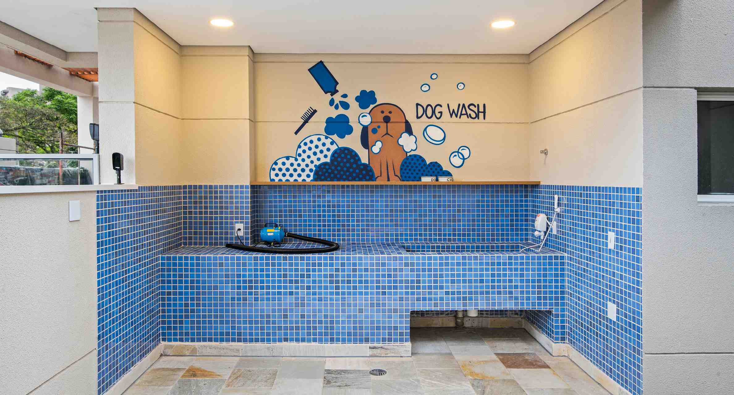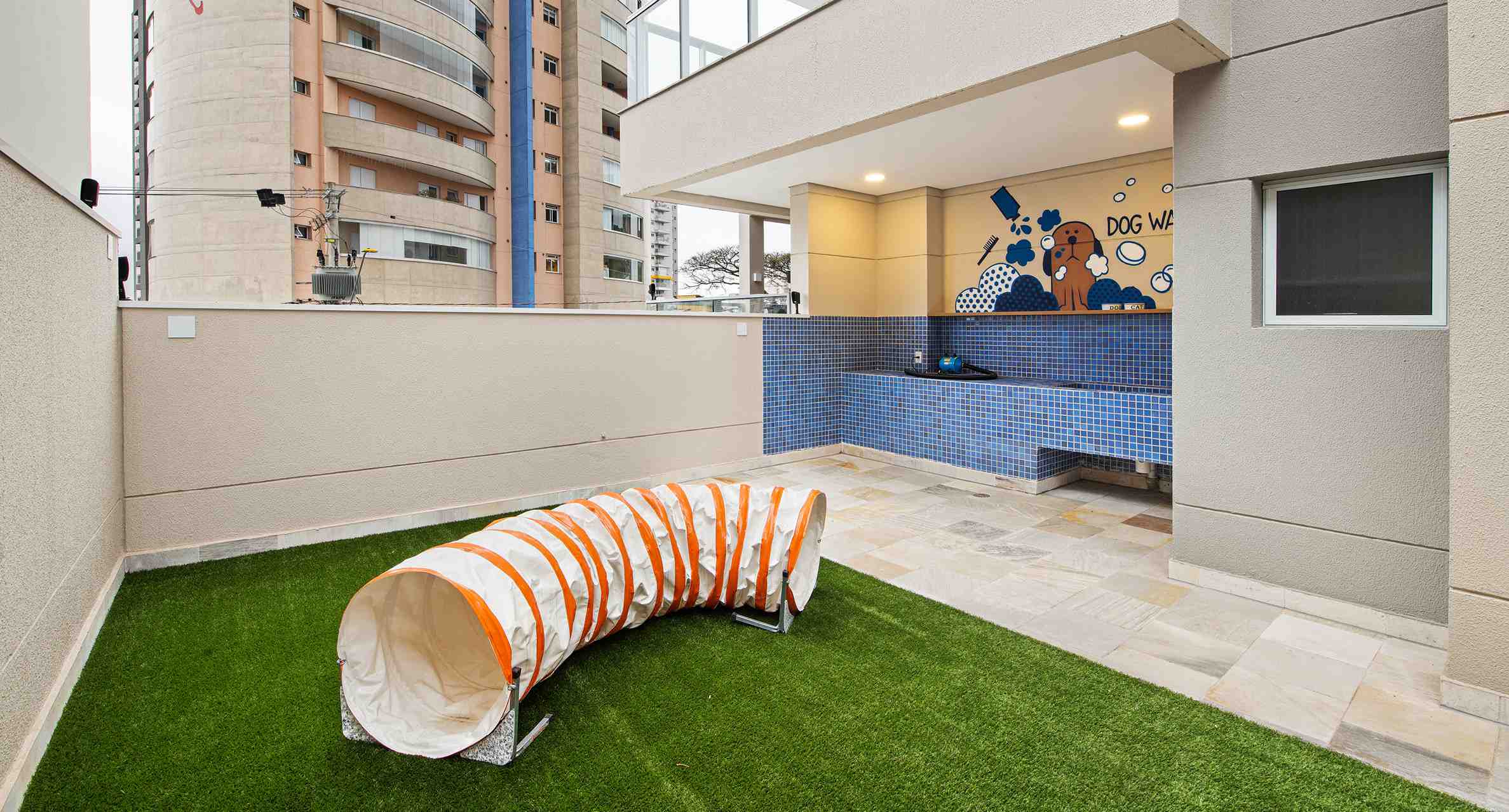 O espaço terá brinquedos que estimulam os amigos de quatro patas e se exercitarem e ainda garantem a diversão dos cães. É integrado com o dog wash onde você pode fazer uma higienização rápida do cachorro porque o local é equipado com duchinha higiênica, aquecedor elétrico e soprador.