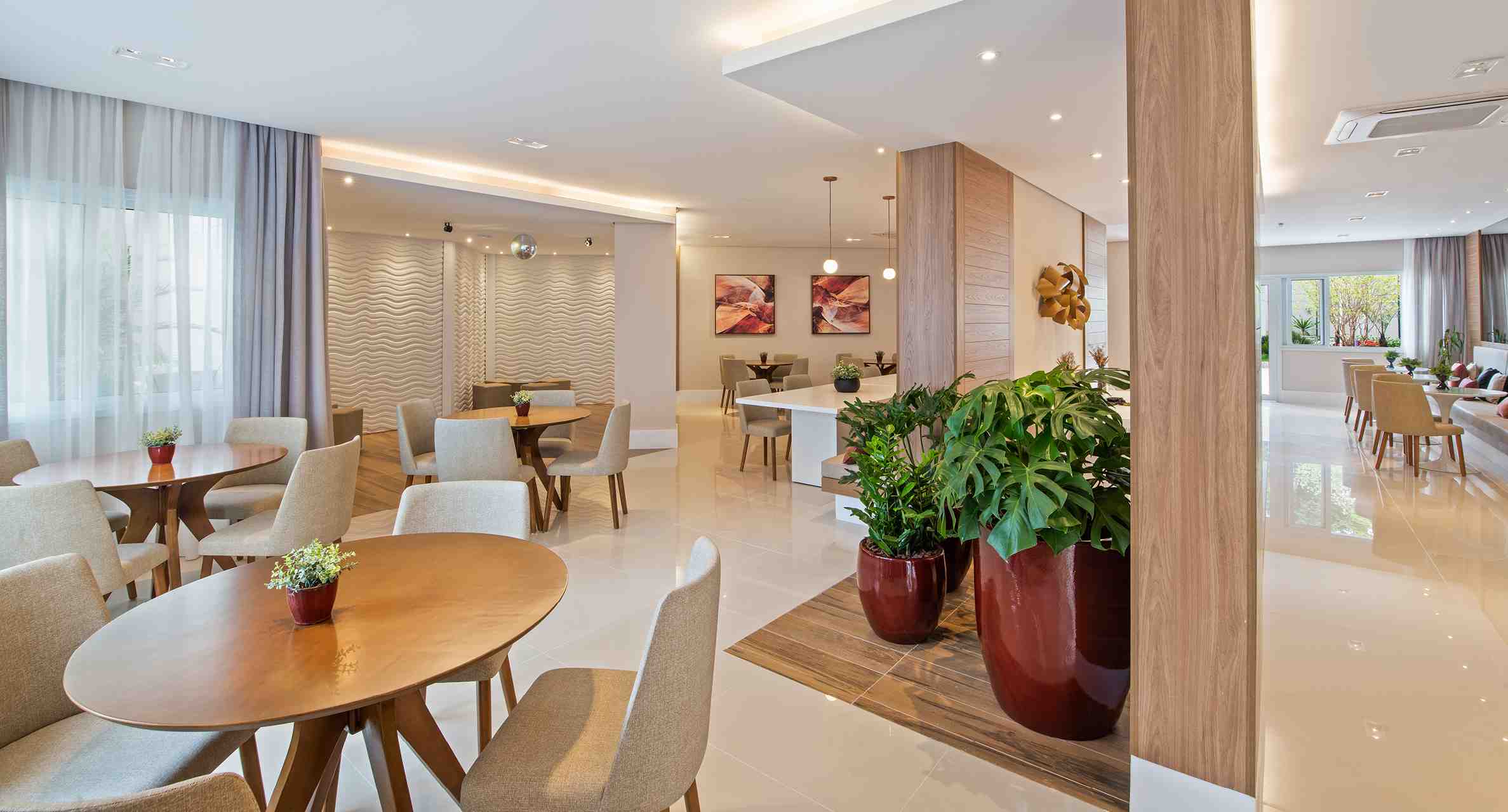 A área social dos apartamentos é incrível. Nos ambientes de jantar e estar têm pontos de ar-condicionado e com essa estrutura, basta instalar o aparelho sem nenhuma adaptação necessária. Além disso, a sala é integrada ao terraço gourmet.