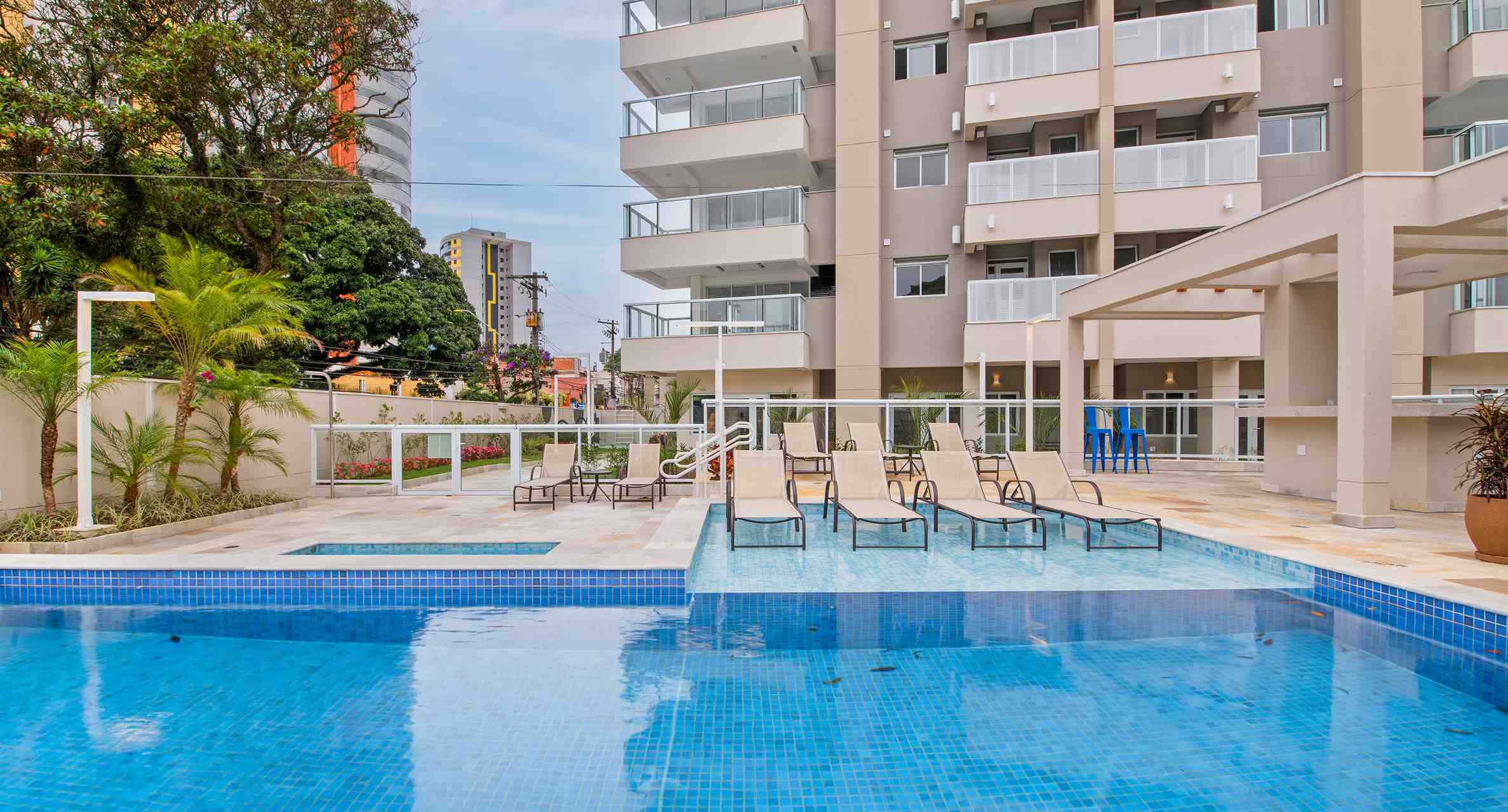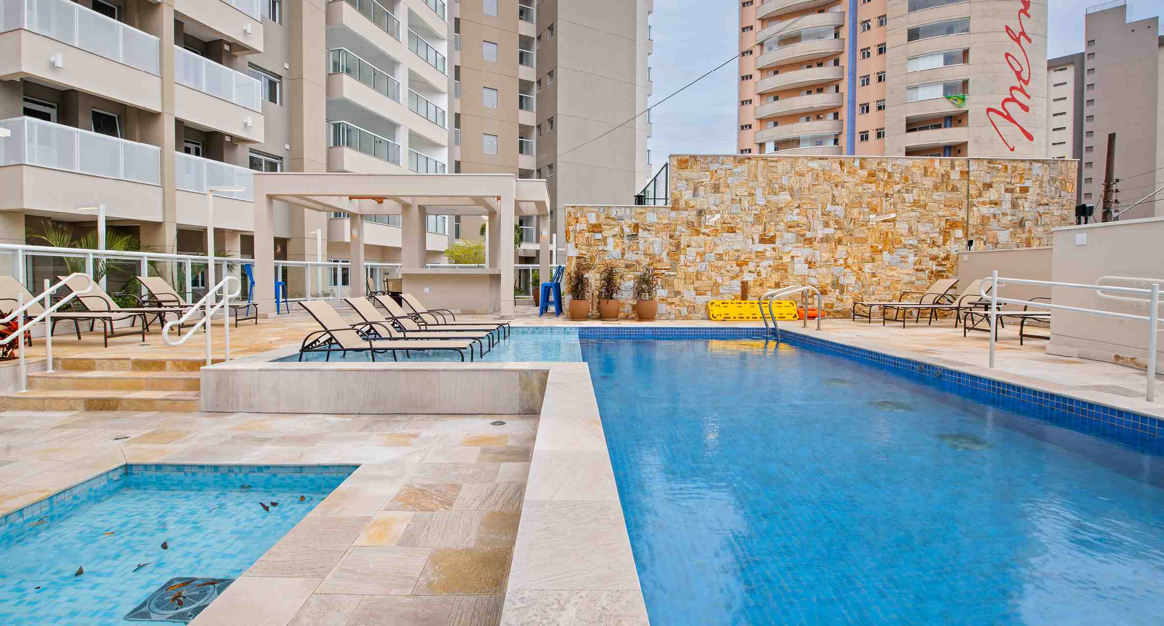 Piscina adulto e infantil climatizadas. A área das piscinas terá espreguiçadeiras, ducha e solarium. Além disso, um bar de apoio com estrutura para fazer lanches rápidos.