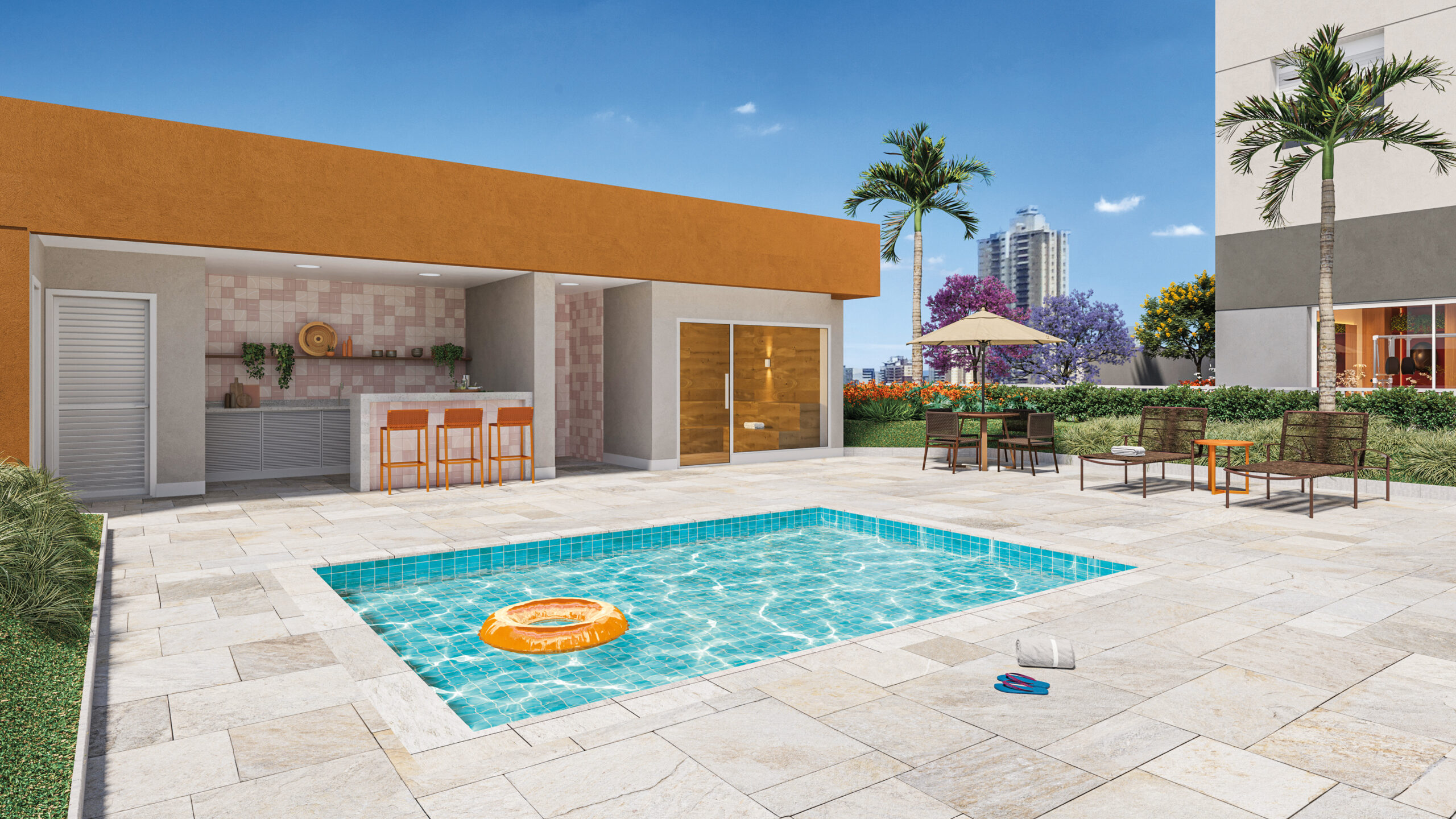 - Piscinas adulto e infantil, com deck molhado,bar da piscina e solarium