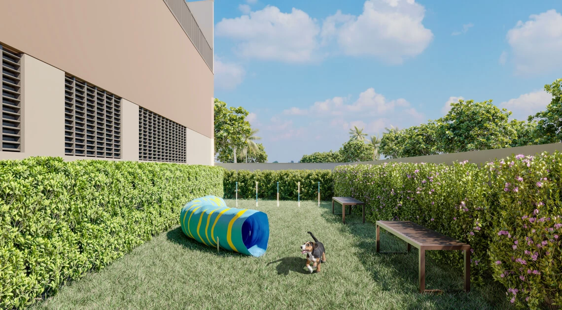 Para os pets, criamos um espaço grande, com equipamentos agility para se exercitarem. Também criamos um lavador com ducha flexível e água quente. O pet brinca e sobe limpinho para o apartamento.