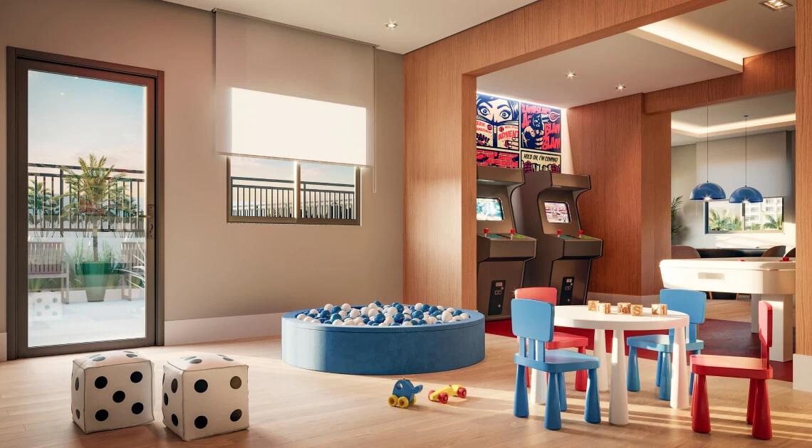 Pensamos nas crianças e nos pets. Para as crianças, um playground emborrachado e colorido e uma brinquedoteca com brinquedos divertidos e educativos.